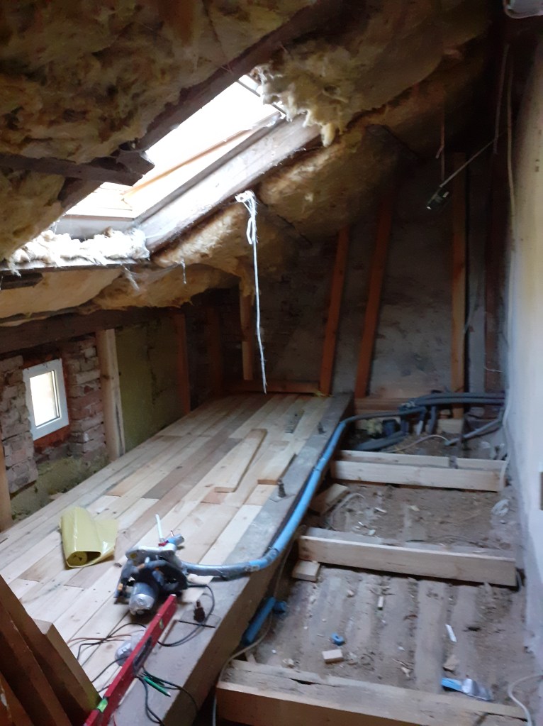 Here is my bathroom created from nothing really. This photo is already a huge improvement to what was here originally. I removed all the rubbish and took it to recycle centre in my trusty little trailer, where I had to sort it out into various containers. The photo was taken after the builder started the work on the floor and water piping, but the sloping ceiling is as it was left originally, just tidied up. There were bats or mice in this mineral wool; we’ve found their droppings and the whole area smelled of animals.