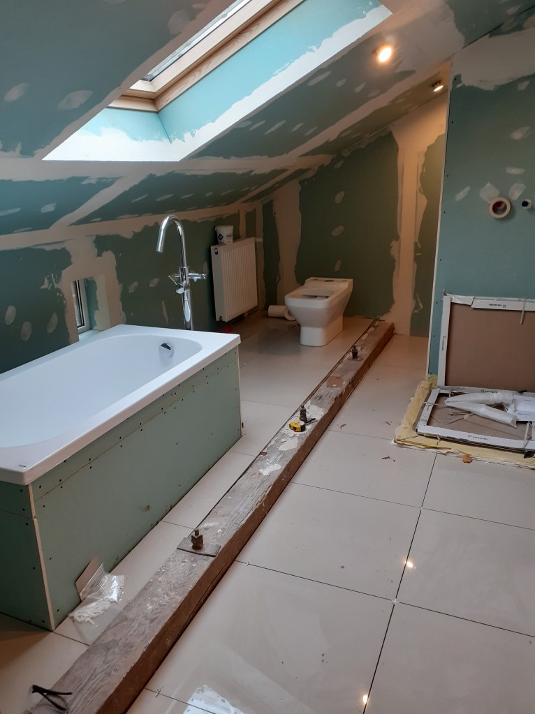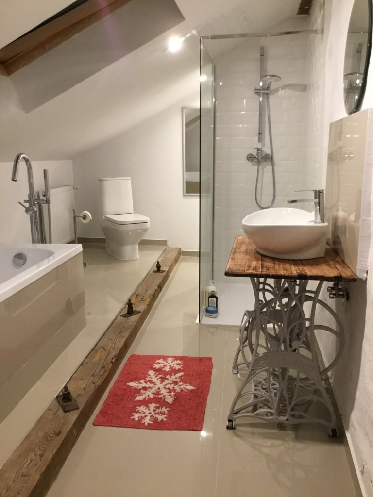 I was talked into dry wall construction, which I don’t like and avoid if possible, but the wall is single brick (the attic was originally used as storage, so the original builders saved money on building thin walls upstairs), so it made sense to insulate it well. I wanted it to look a bit special without spending a fortune so bought a small bath tub, but installed a standing faucet for it. The shower is open and has sheet of glass on one side only. Settled on the normal, old fashioned central heating unit. I find that those bathroom towel drying ones get air at the top part too often and it’s a pain to let the air out again, and again.