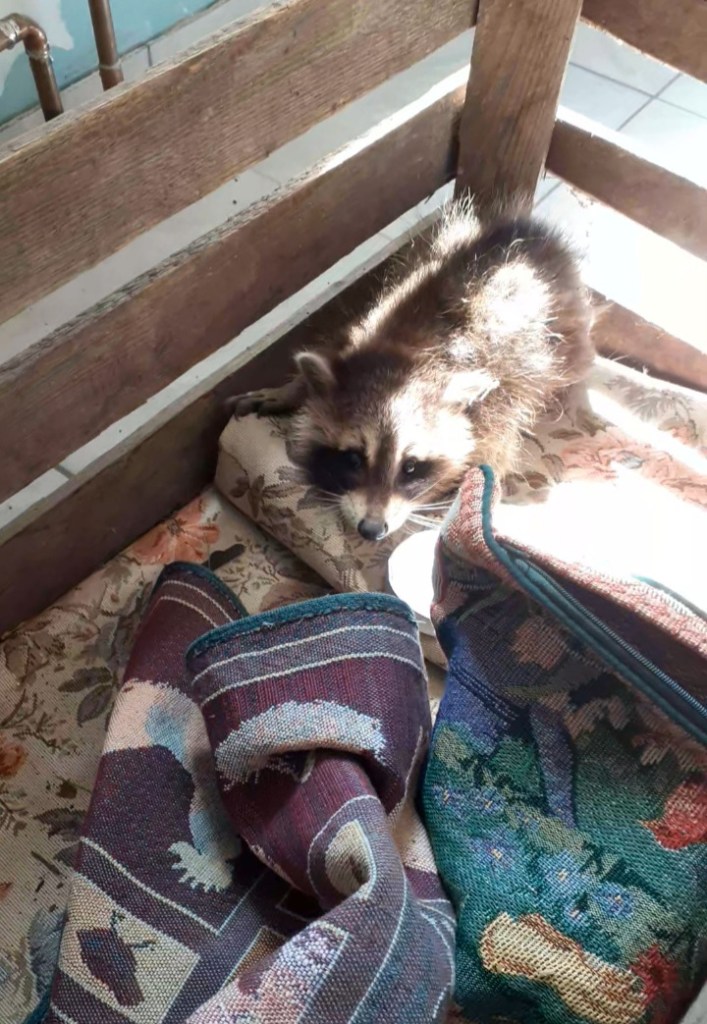 I had a lovely visitor at home yesterday. It wasn’t so lovely for him. I heard strange screams in my garden and dogs were very loud. It turned out a baby raccoon was mauled by the dog next door and climbed over the fence to our garden. Luckily, my dogs are not blood thirsty beasts and they bark squeaky little barks when encountering representatives of the local wildlife. I locked them inside the house, asked children next door to lock their dog and put a thick autumn jacket and garden gloves on, so the little creature didn’t scratch me. I covered him with a towel (watching rescue videos of scared dogs being caught paid off) and put him in an apple crate. I was completely clueless what animal it was. Looked like a raccoon, but raccoons don’t live in Europe, I thought. I googled the information and it turned out that they live in Germany. They were brought here in 1920s to fur farms and after the WWII were let go into wilderness. There are about 1 million of them and they are considered invasive species. One cannot keep them or let them back to the wild. I established with the help of the internet that the baby was about 8 weeks old and what he needed to eat and raced to the local Penny to get a baby formula and raw chicken breasts. Brought the food back and used the bird feeding syringe (yes, I have it) to squirt some milk in the little one’s mouth, which at the beginning didn’t go very well. He was growling at me a bit when I touched him with the syringe, but once he understood that the warm food comes from it, he calmed down and started to lick. He loved raw chicken covered in milk too and I started to worry that he ate too much, but he just relaxed and fell asleep. I fed him again in 4 hours and added strawberry to his chicken. He ate some of it too, but chicken and milk were his favourite. While he was sleeping, I was searching the internet for local wildlife rescues which seem to not exist in this area. I found a raccoon rescue group on Facebook, whose members are located mostly in western and central Germany and someone from it pointed me onto someone who knows someone else etc. Anyway, that night I took the little one to a lady who took him to a person who already has two baby raccoons in her rescue and where “my” little one will live from now on. The outcome is both sad and happy. He will be safe, his wounds will be taken care of, but he will never know freedom. I was told by a few rescuers I spoke with, that I shouldn’t give him baby formula because they have runs afterwards, but the formula chosen by me kept his tummy fine. If anyone, ever, finds a baby raccoon and there is no goat milk or a baby cat formula lying around at your home, Bebivita Folgemilch nach dem 6 monat is the one to get. My French friend named him Ricky and the rescue agreed to keep the name.