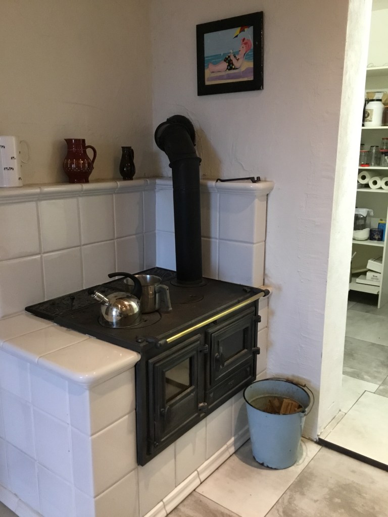 The wood stove above is the old Westfalia you can also see in the third photo above. I had it built up with bricks and tiles to keep it warm for longer. There is no other heat source here but this little wood burner performs very well. The chimney it goes to warms up walls and on warmer winter days I use it to warm the kitchen, the dining room and my office. I found the tin bucket I use for wood in one my sheds.