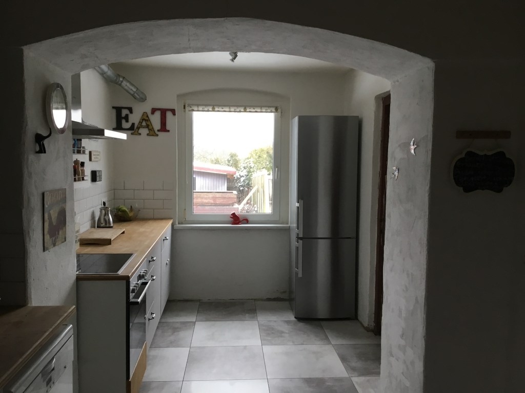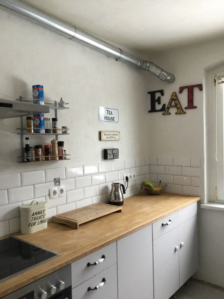 I am very happy with this pipe near the ceiling. The air from the hood is blown outside through it. I wanted something inexpensive that would look industrial and old fashioned and it does, just for a few Euros. Bought new handles for cupboards to make them look old. I painted walls with eco lime paint so walls breath freely. I like to use metro tiles in kitchens and the shower in the bathroom is also tiled with them. Had some left overs so why not use them? Although it didn’t cost me much to renovate it, I love this kitchen. If I was doing it again I would go the same route.