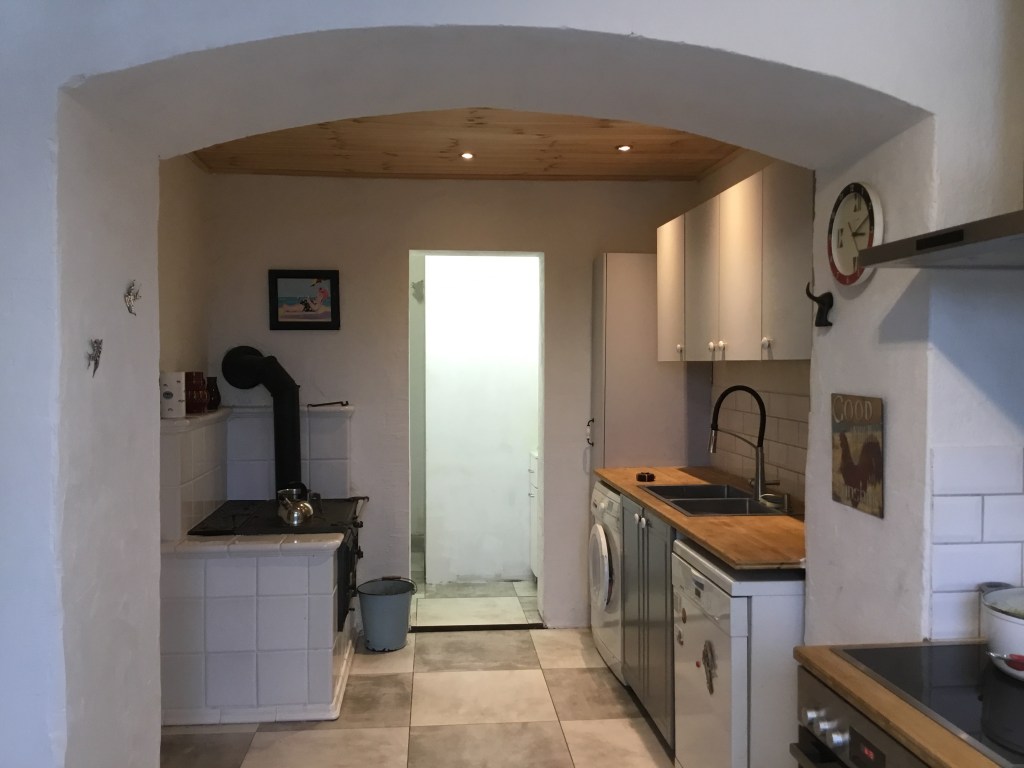 Below: This is the new view from the window. I had floors tiled with cheap tiles and used orange cupboards are painted grey. I kept the dishwasher and washing machine the owner left behind. They are good makes (Miele and Samsung) so will be with me until they’ll stop working. There is a small pantry behind the narrow doorway. I bought a nice sink and a pretty battery for it. They were not very expensive but look like they were. The cabinet underneath the sink is Ikea one.