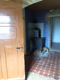 Below is the view away from the window, so it shows how small the room was. The floor tiles were original, but too damaged to be saved. We tiled on top of them. The brown door leads from the small entry hall which leads to the garden. I removed it to gain more space; it was partially eaten by woodworm and smelled really bad anyway.
