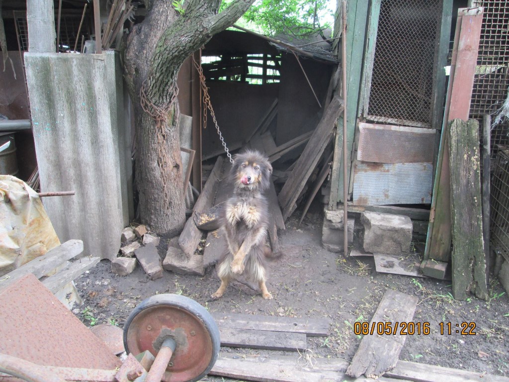 I saw Charlie on Facebook, advertised by the rescue centre Friend in Ukraine. A few volunteers were driving past the place where he lived, took photos, arranged to get him out and I saw the story. I have decided to get him and find him a nice house in UK. I have just sold my house and knew I was going to California to live there permanently, but I just could not leave him there, to join other dogs at the rescue centre after the awful life that he lived until now. I organised for him to be delivered to Poland where I would collect him. He could travel to UK but it would take much more time, which I didn’t have. He came vaccinated from Ukraine, but because he arrived in EU he had to be vaccinated again. Below is the photo which made me to adopt him. The chain was so short that he spent his life jumping on two legs and the collar has grown into his neck. As a result he had a thick, hairless scar tissue circling his neck, which never disappeared.